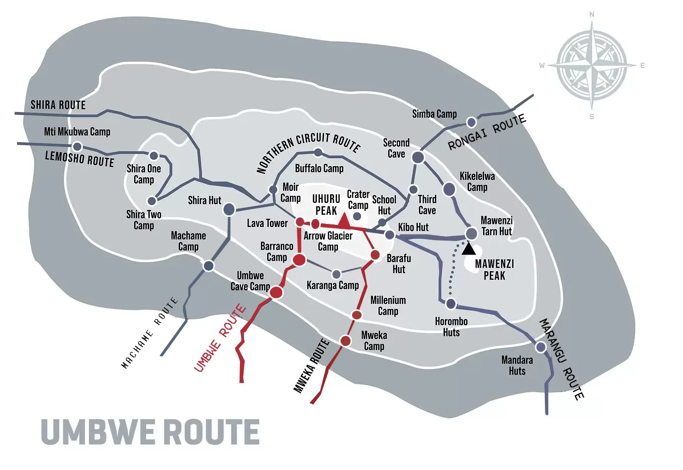 The Umbwe Route is among the least-traveled paths on Mount Kilimanjaro, offering a tough yet incredibly rewarding climb. Known for its steep and direct ascent, especially in the first two days, this route demands good fitness and preparation. Beginning on the southern slopes, the trail ascends quickly through thick rainforest and later connects with the Machame and Lemosho routes near the Barranco Wall on day three. Its early isolation makes it an excellent choice for climbers who prefer a quieter, more intense trekking experience.